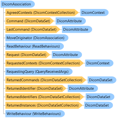 A DicomAssociation Object represents the current state of an association, and may either be created automatically in response to an incoming query request, or explicitly by the client program. Methods of this object are used to send data, images, and verification requests. There is not a one-to-one correspondence between DicomAssociations and associations, as one incoming association may cause several DicomAssociation objects to be produced, one in response to each incoming command, and likewise, an outgoing DicomAssociation object may during its life serve more than one association, but at a given time, each association is represented by one, and only one DicomAssociation.