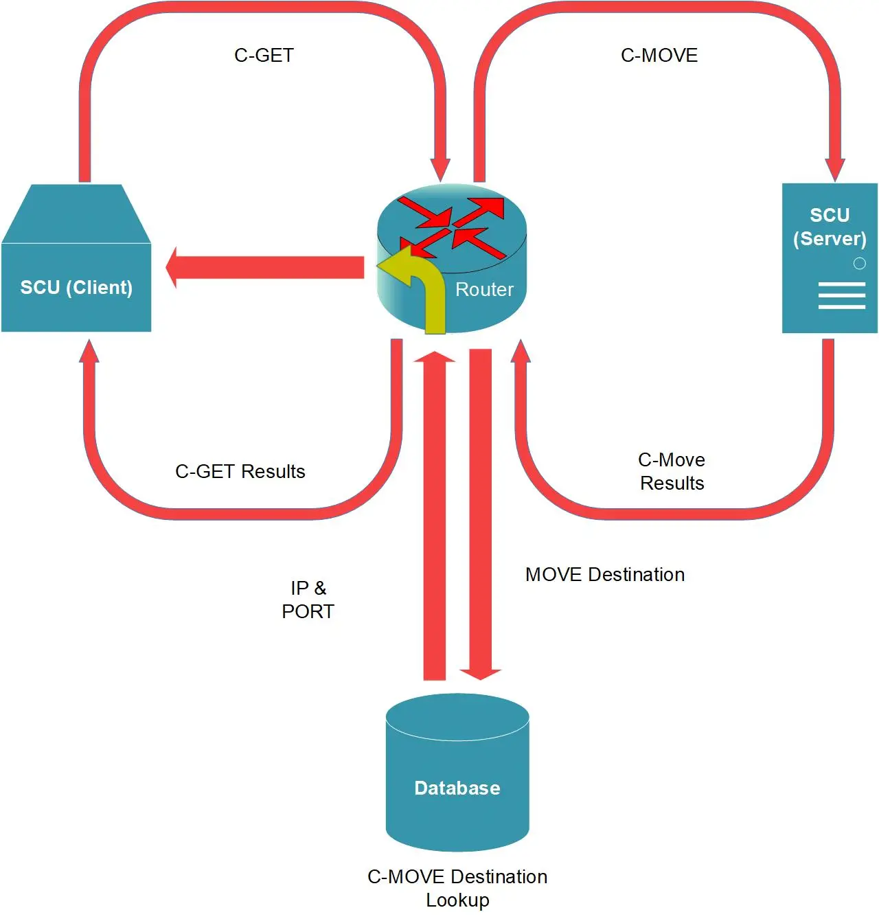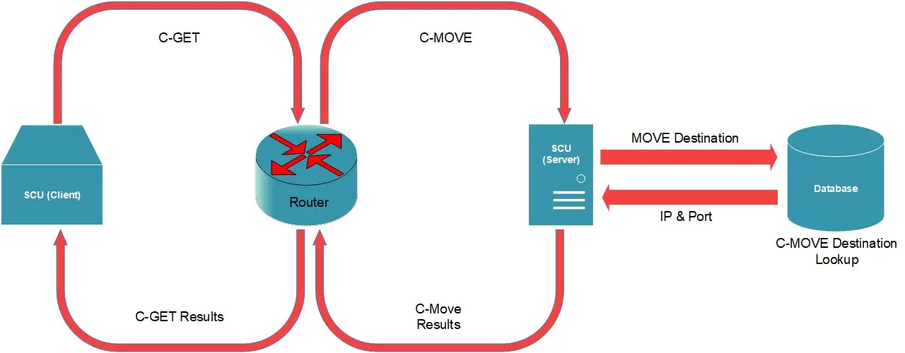 Using C-MOVE to handle C-GET is more difficult than using C-GET, due to the complex nature of C-MOVE. It requires close co-ordination between Router and Server, IE. Move Destination AET Lookup on server and router must be listening on the correct port, which is associated its AET.