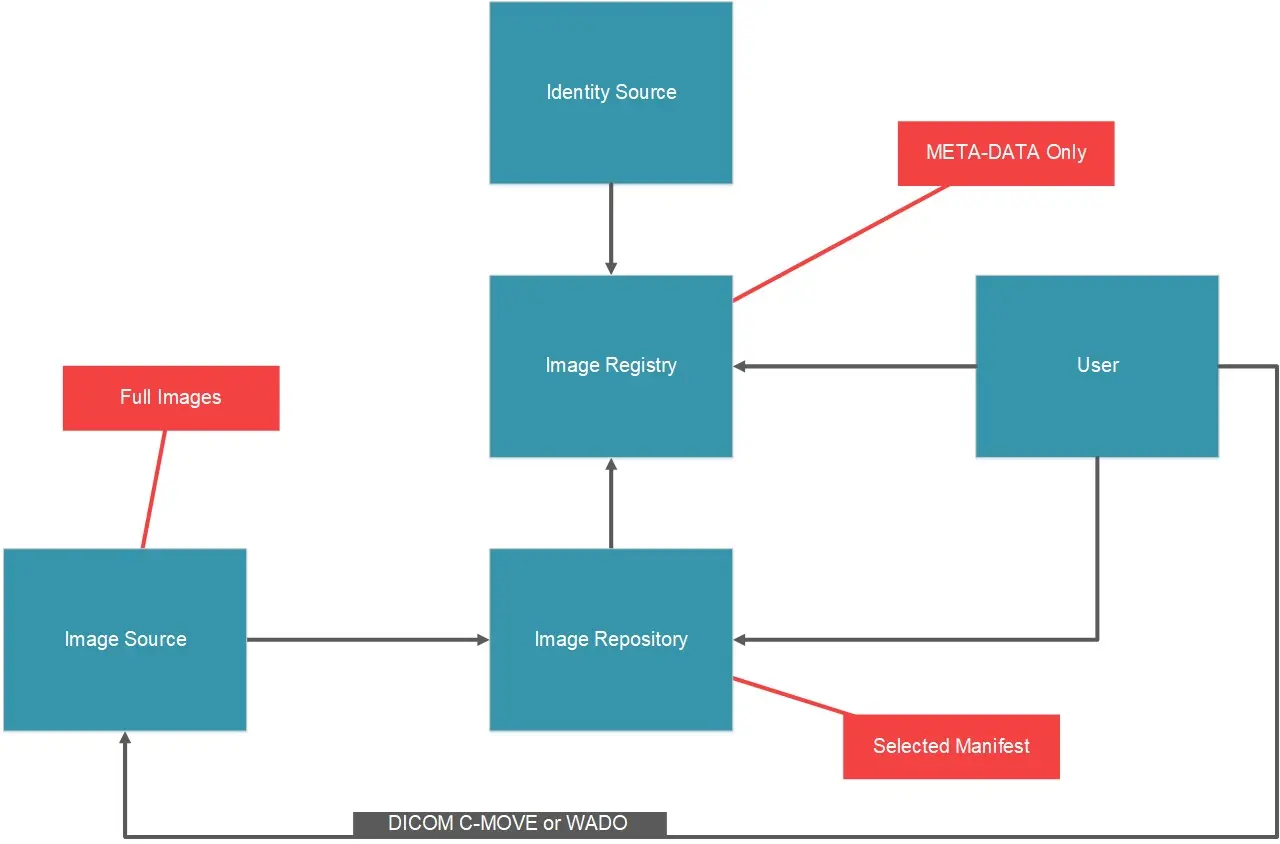 XDS for Imaging (XDS-I) is an extension to the IHE XDS protocol explicitly for imaging, which stores a DICOM Key Image Note (aka Key Object Selection Document) as the stored object in the Document Repository which in turn lines to the images in the “Image Source” (normally the original PACS, or perhaps a regional equivalent).